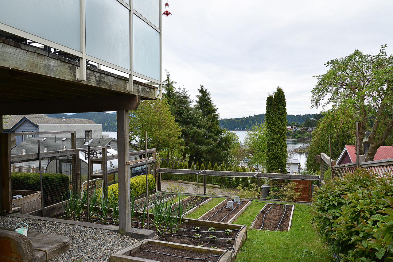 This bright contemporary home in the heart of Lower Gibsons, with spectacular views of Gibsons Harbour, is just steps away from restaurants, shops, the library and public market. This three bedroom, two bath home, is a relaxing oasis with a large deck, hot tub, greenhouse and mature vegetable gardens. Recent upgrades include: hardwood floors, on demand hot water system, gas fireplace and a beautiful master ensuite with in-floor radiant heat. Home has been freshly painted throughout with custom draperies and window coverings.