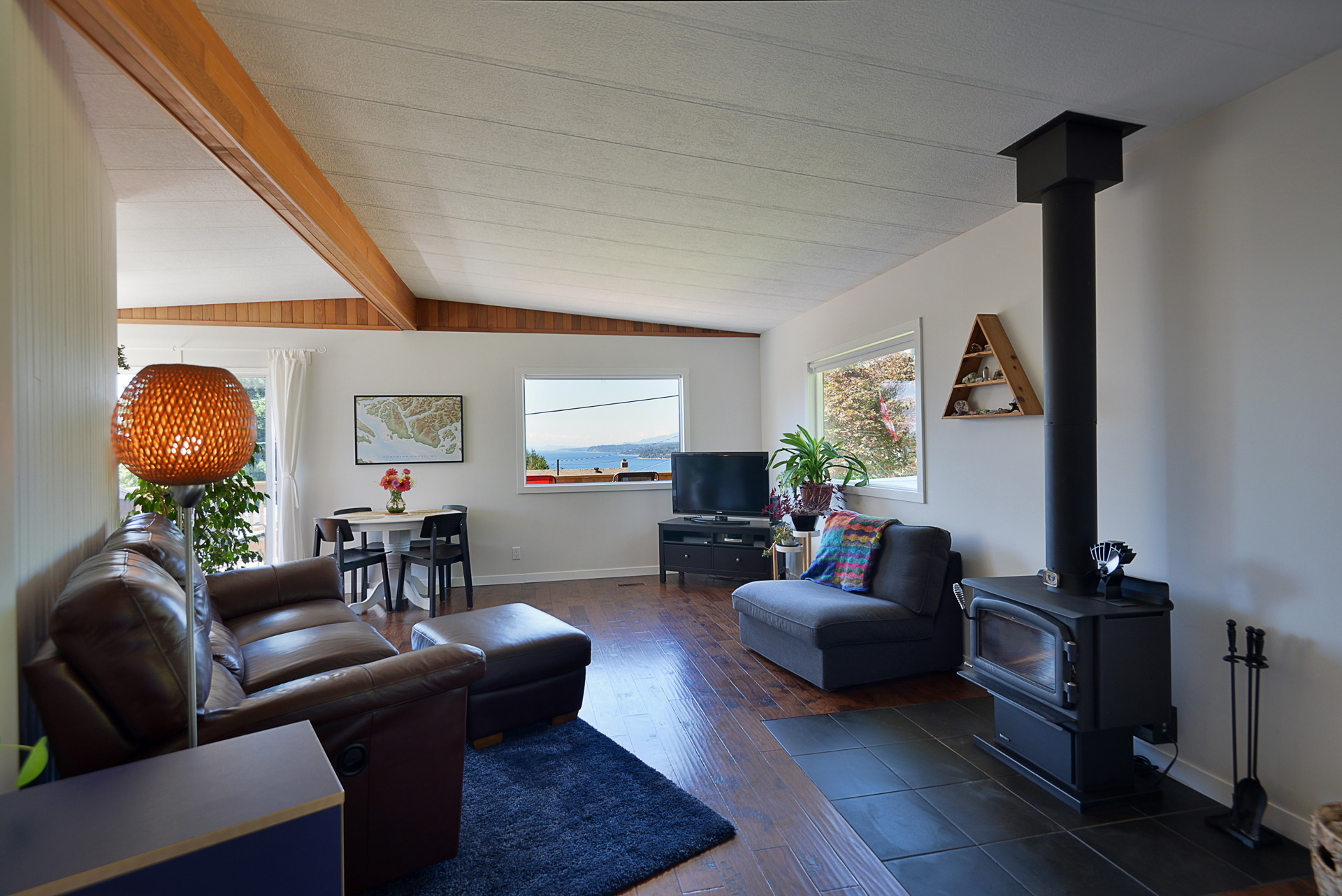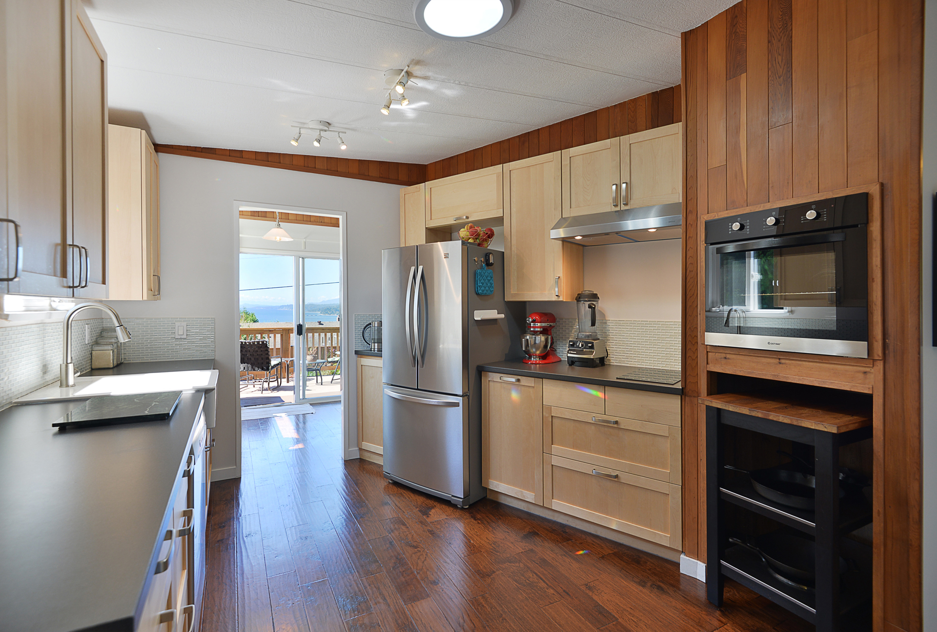 MOVE IN READY, modern updated kitchen and bathroom, low maintenance rancher. Spectacular west ocean-views of Trail Islands and Vancouver Island. Perfect spot to watch sunsets from the deck! S/S appliances, induction cook-top, engineered hardwood floors, new gas furnace (2019), wood-stove, new low E double glazed windows and soaker tub. Includes 480 sq ft ocean-view workshop/artist studio with 220V, covered boat/RV parking and shared greenhouse. Gently-sloped 1/3 acre lot (100' x 135') with mature fruit trees, berries, veggie and flower gardens. Convenient location 5 minute drive to Davis Bay beach and nearby shopping centres. Near bus stop for car-free travel to the ferry.