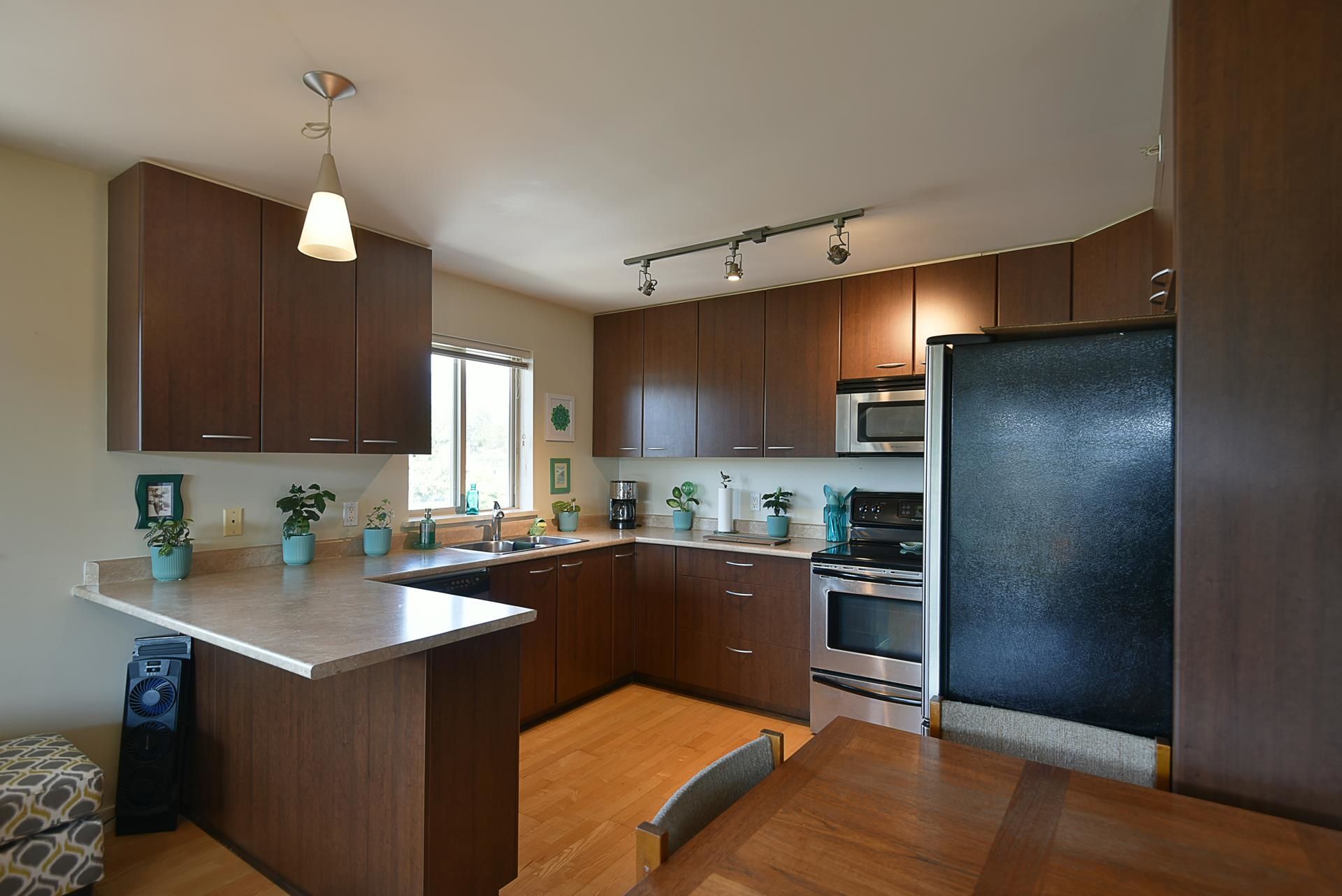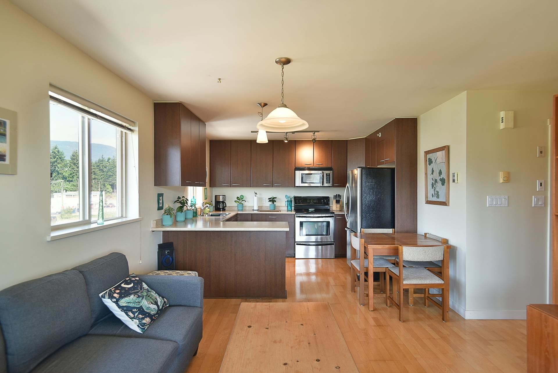 Tons of natural light in this top-floor corner unit with two bedrooms, an airy open plan and a cozy gas fireplace. The modern kitchen features stainless steel appliances, while in-suite laundry adds convenience. With no one above and only one neighbor beside, privacy is assured. The west-facing sundeck captures sunsets and being a corner unit the extra windows enhance the bright, inviting feel. In a prime downtown location, just steps to shops, dining and public transit. Rentals allowed and pets allowed with restrictions.
